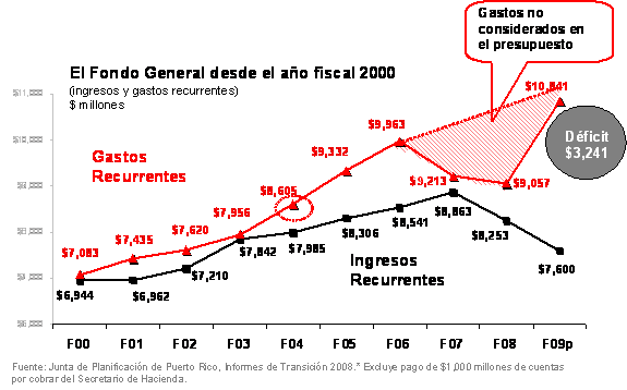 El resultado neto de estas prácticas es un desfase total entre los ingresos y los gastos recurrentes del Gobierno y el entroncamiento de un déficit estructural que para el año fiscal en curso aproxima $3,200 millones y que se proyecta continúe por encima de $3,000 millones anuales por los próximos años fiscales de no tomar medidas inmediatas para estabilizar nuestra situación fiscal y desarrollar nuestra economía.