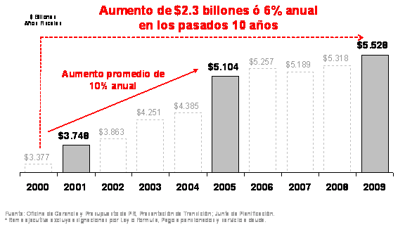 El patrón descrito de sobre-estimación de crecimiento económico y recaudos con su concurrente inflación de gastos permitió al Gobierno seguir aumentando la nómina gubernamental fuera de toda proporción con la realidad de nuestros recaudos y nuestra economía. La nómina del Gobierno creció un promedio de 6% anual, para un total de $2,300 millones, entre los años fiscales 2000 al 2009, mientras nuestra economía tuvo un crecimiento promedio de escasamente un 1% anual y efectivamente se ha contraído durante los últimos tres años. Específicamente, en el 2001 el gasto de nómina del Gobierno fue de $3,748 millones, mientras que, en este año 2009, el gasto de nómina se estima en los $5,528 millones. Desde el año fiscal 2005 al año fiscal 2009 la nómina creció $424 millones, a pesar de una recesión que empezó en el fiscal 2006. Del año 2001 al 2008, el Gobierno añadió no menos de 49,000 empleados. Este gigantismo gubernamental es la triste herencia de las últimas dos administraciones.
