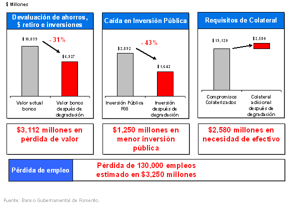 La degradación de nuestro crédito a “chatarra” sería catastrófica para Puerto Rico. La consecuencia inmediata de esta degradación sería una devaluación drástica en la orden de 30% a 50% en el valor de todas las obligaciones del Gobierno Central y demás instrumentalidades públicas. Todas las cuentas de retiro individuales, los planes de retiro, tanto públicos como privados, y las cuentas de ahorro e inversión que estén invertidas en bonos del Gobierno se verían seriamente afectadas. El impacto sería masivo a todos los niveles de nuestra sociedad, desde la IRAs Educativas para la educación de nuestros hijos, a los planes de retiro de nuestros empleados, hasta las cuentas de inversión del Gobierno y nuestras corporaciones privadas. Al presente, hay sobre $10,039 millones en bonos del Gobierno en manos locales que perderían entre $3,000 y $5,000 millones de valor como consecuencia de una degradación.